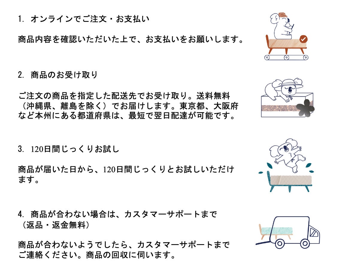 「120日間トライアル」とは、商品を120日間じっくりとお試しいただける期間のことです。コアラ全商品が対象で、万が一ご満足いただけない場合は、返品・返金が可能となります。