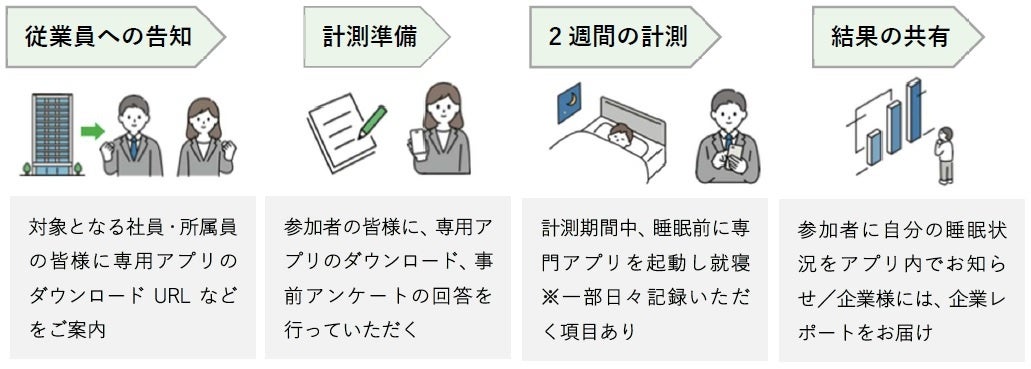 健康診断をきっかけに自分の健康を改めて気にするのと同じように、年に1度、自分の睡眠の状態を計測することで社員や所属員の皆様が“自分の睡眠を意識する”機会をつくります。