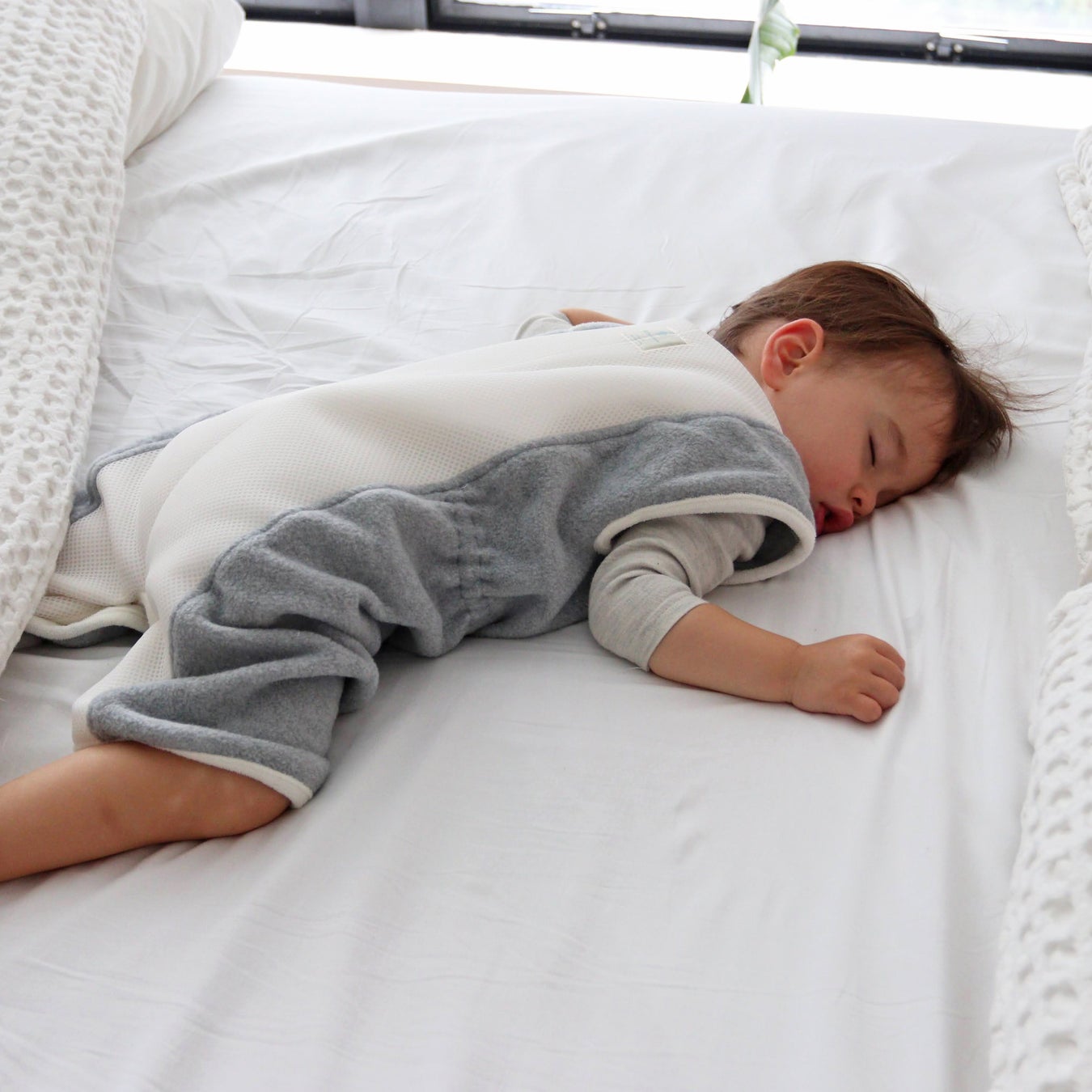 体温調整が未熟な乳幼児は入眠時や寝ているときも汗を沢山かきます。こもりがちな熱や汗をしっかりと発散してあげることで、汗疹や寝冷えを防ぎます。BabyGooseのスリーパーは、お腹周りはしっかりと保温するフリース素材、背中は立体メッシュで入眠時に籠りがちな体温や汗を発散させます。肌にあたる立体メッシュの裏面(背中側)や、顔周りは肌に優しく汗を吸う綿100%を使用しています。スリーパーの下に着る洋服を半袖肌着や、長袖パジャマ、素材等を薄手~厚手に変えることで、初秋から春先までと使用可能です。