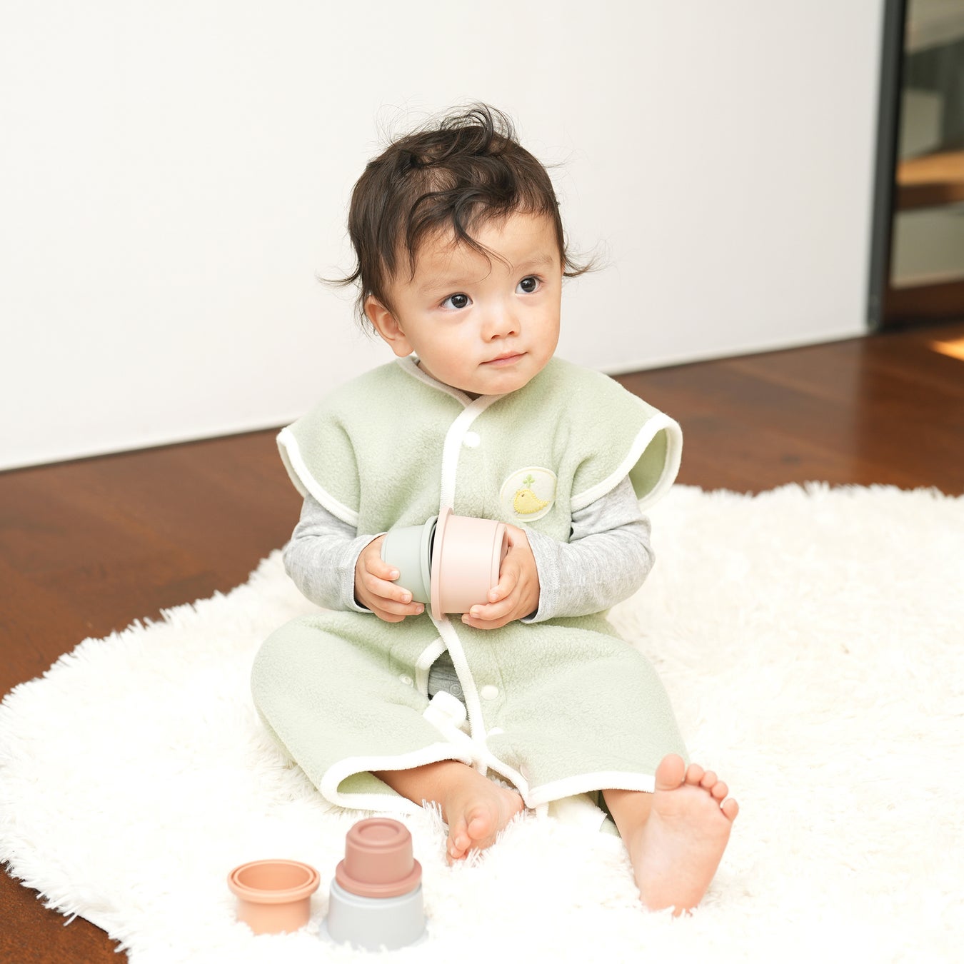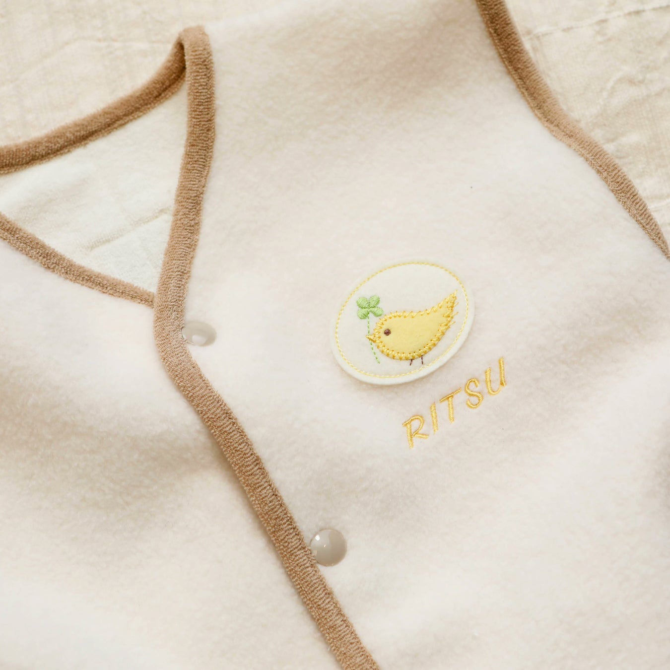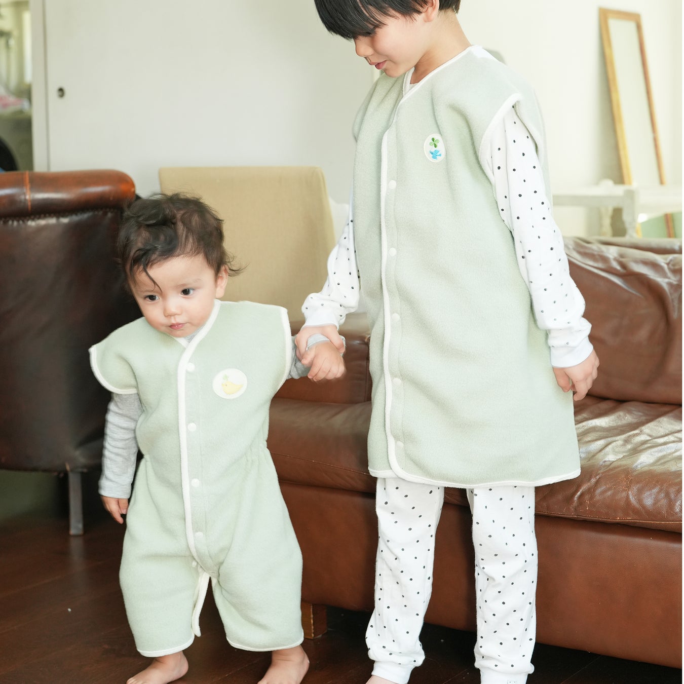 1歳半頃までは足元のスナップを留め、ロンパースタイプとして使用できます。股下を固定できるので、足をばたつかせてもはだけることもなく、お腹周りを冷やしません。また、1歳半を過ぎた頃からスナップをはずしてベストとして、3歳頃まで着用出来ます。月齢にあわせて長く使えるようにしました。