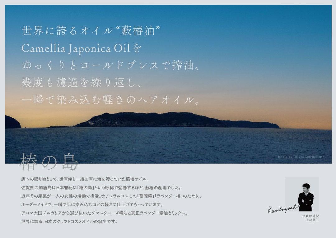 佐賀県加唐島産のヤブツバキからコールドプレスで搾油した常識を覆すサラサラヘアオイルに、ブルガリア産オーガニック真正ラベンダー精油をプラス。