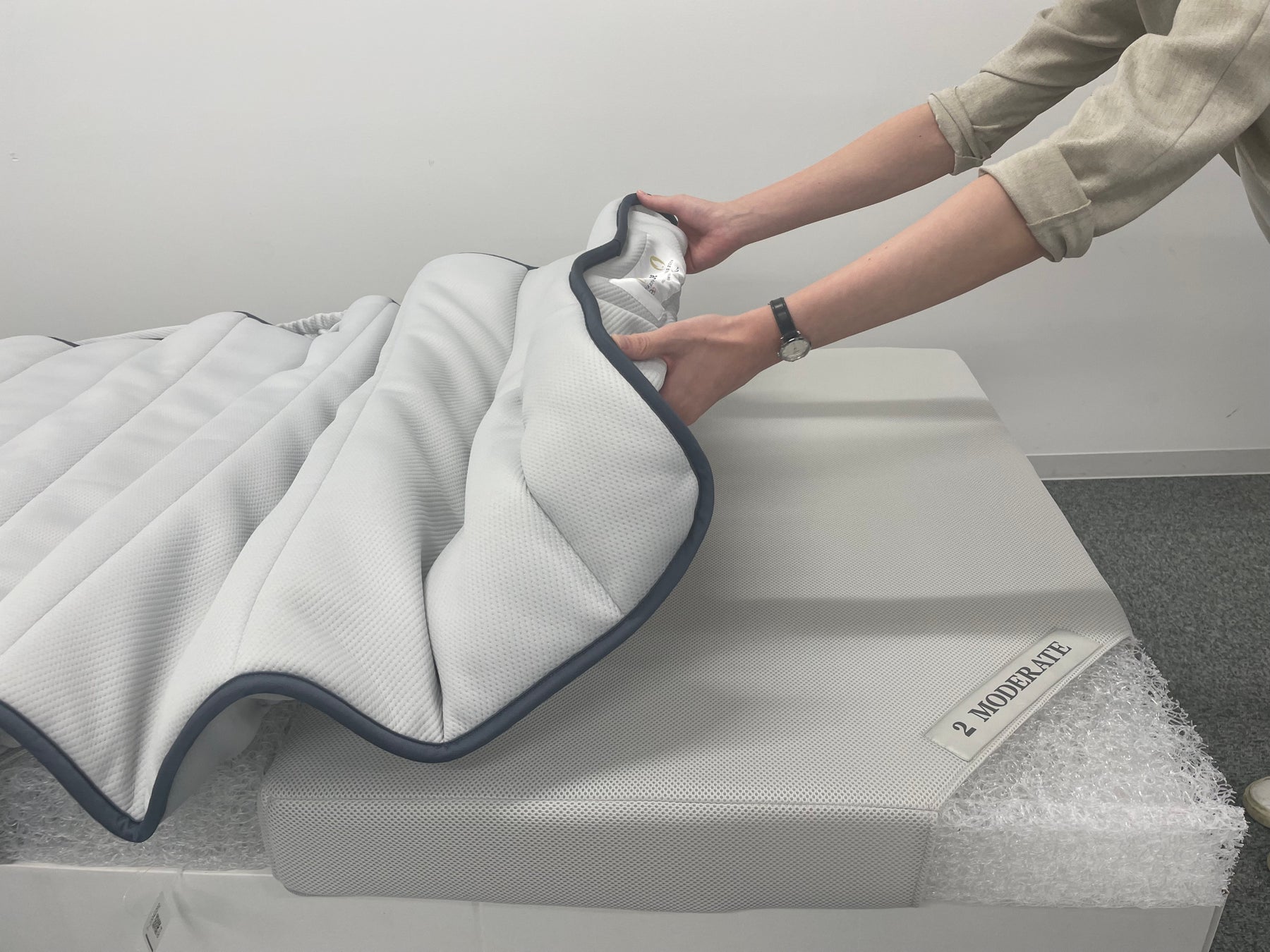 表裏で硬さが異なる3つのパーツで構成されています。腰のパーツを硬くすることで腰への負担を軽減したり、肩のパーツを柔らかくすることで寝返りをしやすくしたり、体形に合わせてカスタマイズができます。カバーはボックスシーツ式を採用し、各パーツにインナーカバーを取り付けたことで、前大会の選手村に提供したファスナー式のベッドマットレスよりもカバーのつけ外しやパーツの組み替えが簡単になりました。