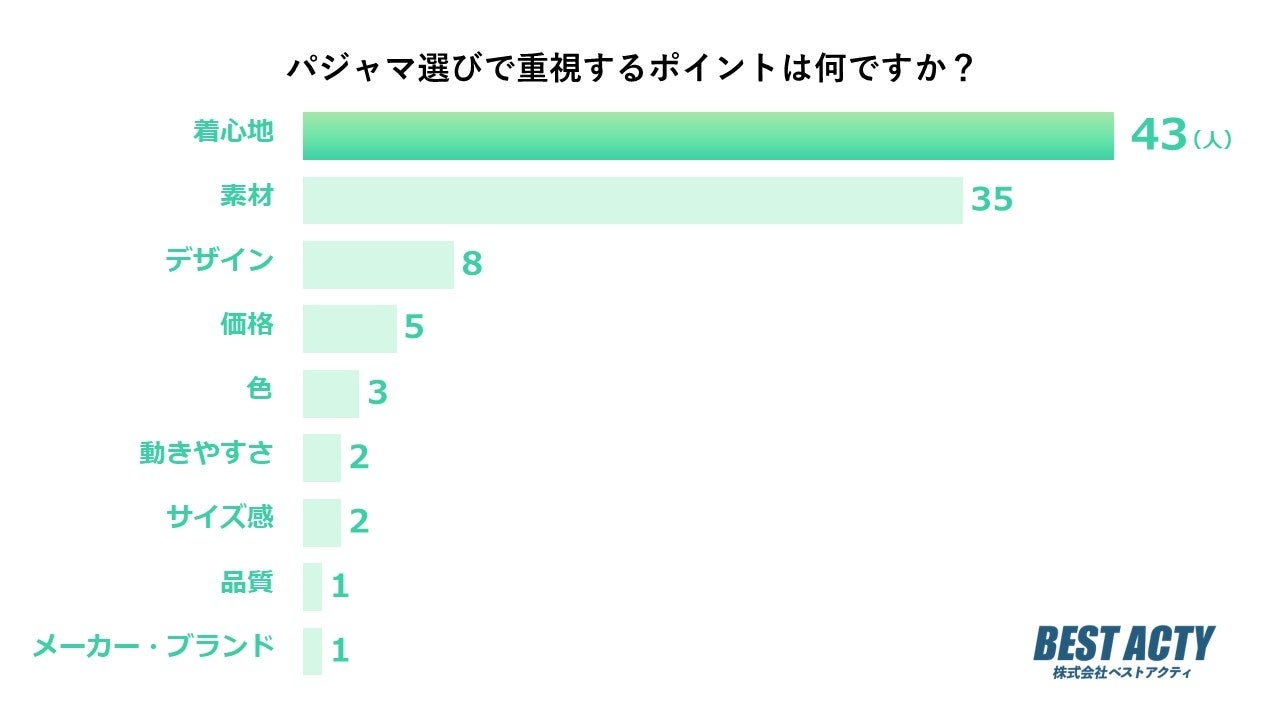 パジャマ選びで重視するポイントについて100人にアンケートを行ったところ、「着心地」と回答する人が最も多い結果となりました。