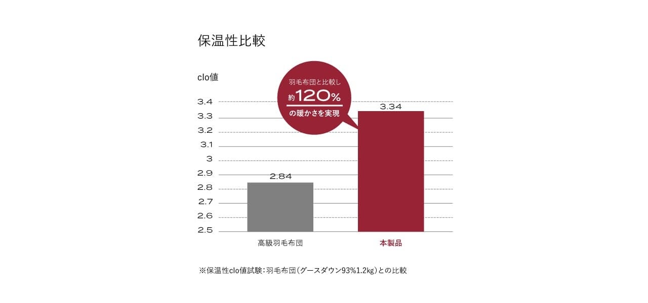 羽毛布団の中でも高品質と言われるグースダウン羽毛布団と比較して、約120%の保温性を実現しました。