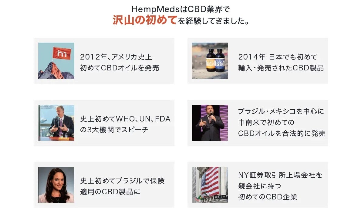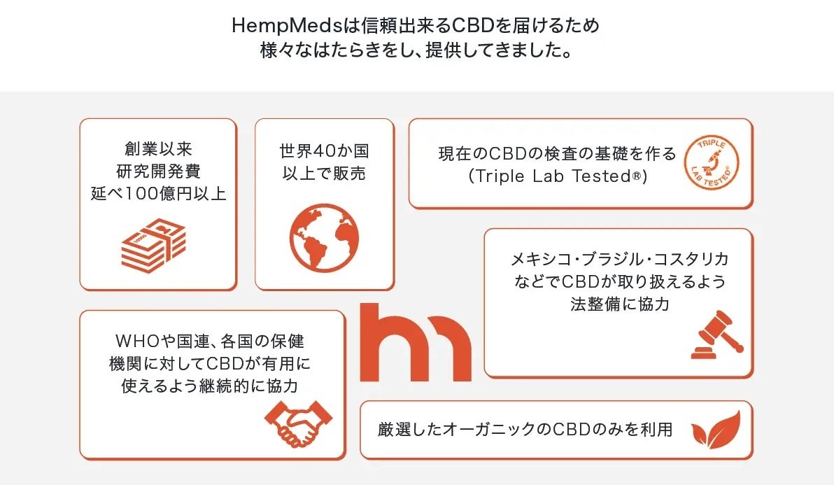 HempMedsは「Your Trusted CBD(信頼できるCBDを)」と「We are the first®(私たちは初めての会社です)」をコンセプトに、2012年にアメリカ史上初めてCBDオイルしたCBDのブランドです。40以上の国と地域での販売、研究開発費は延べ100億円超、ブラジルやメキシコでは医療現場でも活躍しています。