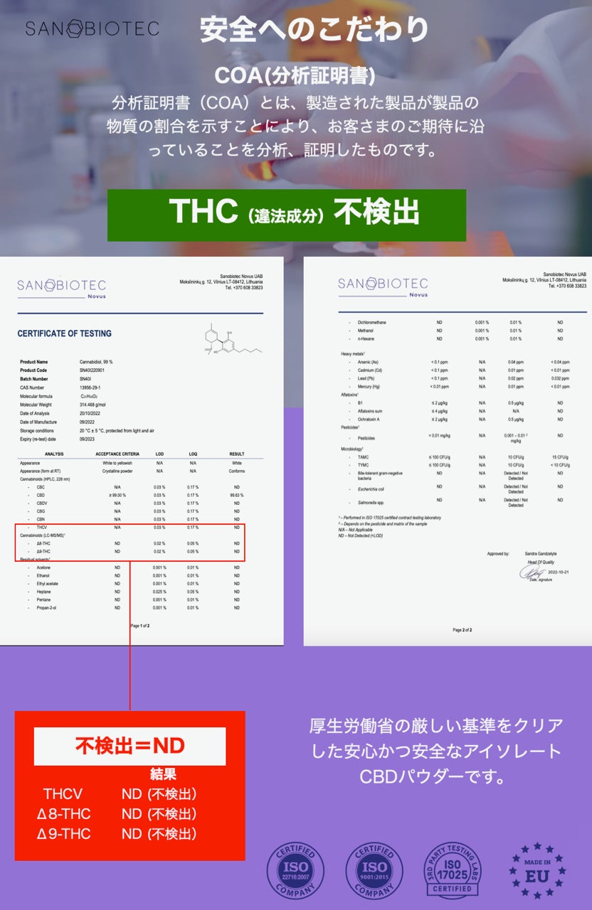 製造元であるSanobiotec社は世界的なカンナビノイド原料メーカーです。オイルやリクイッドだけでなく、アイソレートも製造しています。メジャーなCBDやCBGだけでなく、マイナーカンナビノイドと呼ばれるCBN、CBC、CBDV、CBGA、CBDAについても長年研究、製造している老舗企業です。同社が提供する高純度のアイソレートは、ウェルネス、化粧品、食品関連市場において高い評価を受けています。