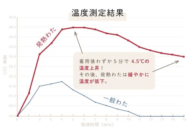 発熱素材の中わたを使用したことで、着用後わずか5分で4.5℃の温度上昇を誇る“あったかアウター”に仕上がりました。