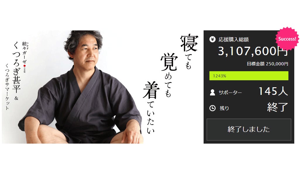 本年5月にマクアケで応援購入を募集した第一弾の「紡々ガーゼのくつろぎ甚平」は、目標金額の1200%超を達成。ワンランク上の睡眠環境を求めて、徹底的に着心地にこだわった『紡々ガーゼのくつろぎ甚平』を開発。たくさんの応援購入をいただき、本当にありがとうございました。