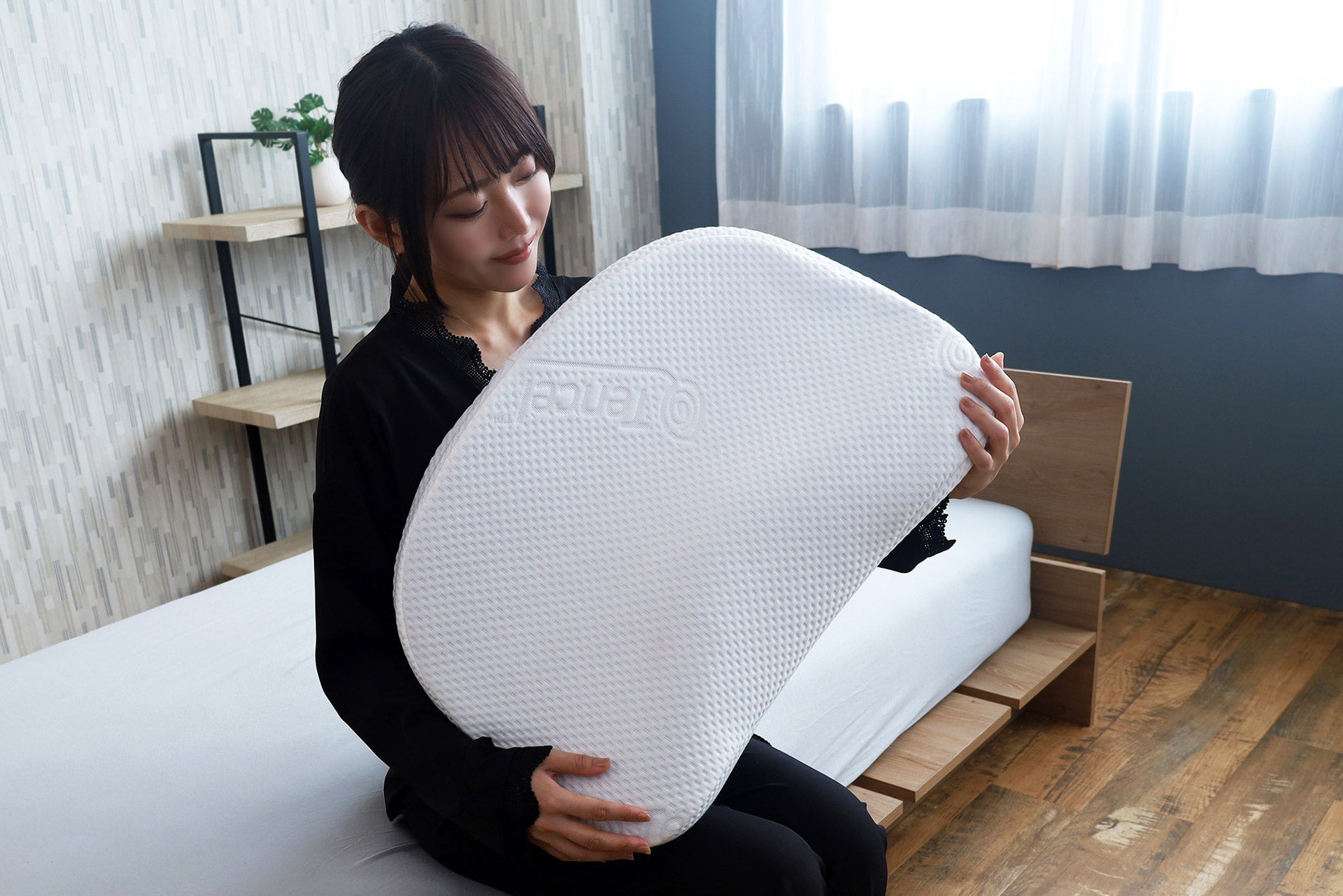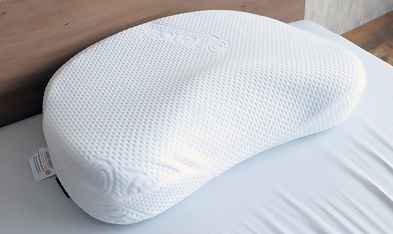 旧モデルはシンプルな長方形であったものが人間の首肩の形状、自然な寝姿勢に合わせて設計された立体的な「エルゴネック構造」に進化。首を支える僧帽筋に沿った湾曲と首の土台「第七頸椎」から支える傾斜でぴったりフィットして首肩リセット。首を支えるネックアーチが寝ながら優しく首をストレッチ。横向き寝にも優しい構造です。