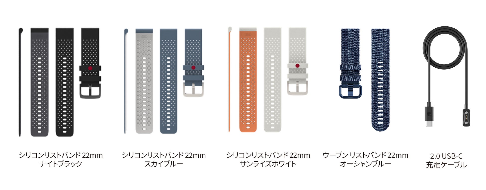 また交換用22mmリストバンドも同時発売いたします。交換用リストバンドは、本体同梱と同じシリコン製ではナイトブラック、スカイブルー、サンライズホワイトの計3色展開。加えてウーブン(エコ海洋プラスチック製)はオーシャンブルーの1色を発売いたします。S-LサイズにはSとM/Lの2サイズのリストバンドが同梱されています。