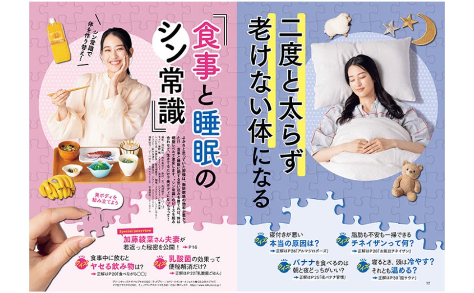 巻頭特集は、【ダイエット特集】 二度と太らず老けない体になる 「食事と睡眠のシン常識」。生きていくうえで欠かすことができない「食事」と「睡眠」。良かれと思って行っているその習慣は、効率が悪いかも?思い込みを捨てて常識をアップデートすれば、体は細胞レベルで激変します。生きてるだけで若返って美ボディになっちゃう習慣をお試しください。