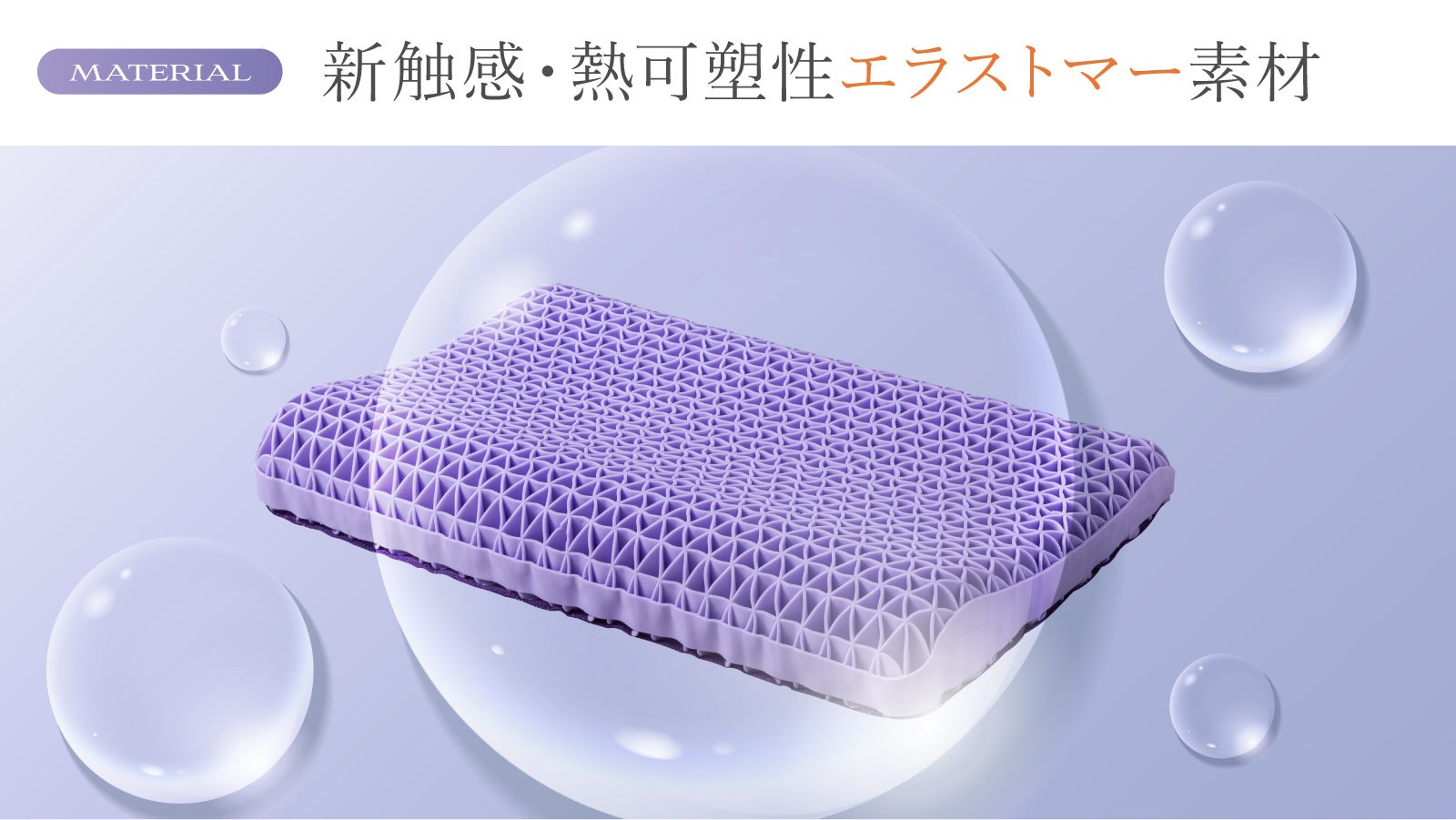 新感覚の高機能ジェル素材が、宙に浮いたような無重力の寝心地を実現! 本体は医療器具にも使用されるTPE (熱可塑性エラストマー) 素材を使用。柔軟性・弾力性に優れたジェル素材が、首や頭のどのような形状にも吸い付くようにフィットします。