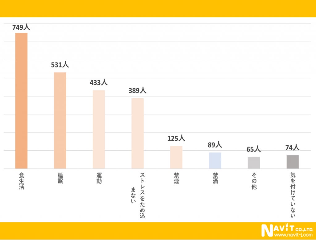 このアンケートは複数回答でいただいています。1番多い回答は「食生活」に対して気をつけているという回答で749名でした。食事の回数は基本的に1日3回あるので、健康対策に取り組むにはチャンスが多いポイントです。次に多かったのが「睡眠」で531名でした。人生の1/3は眠っていると言われているので改善すると効果が大きいでしょう。3番目は「運動」で433名という結果になっています。