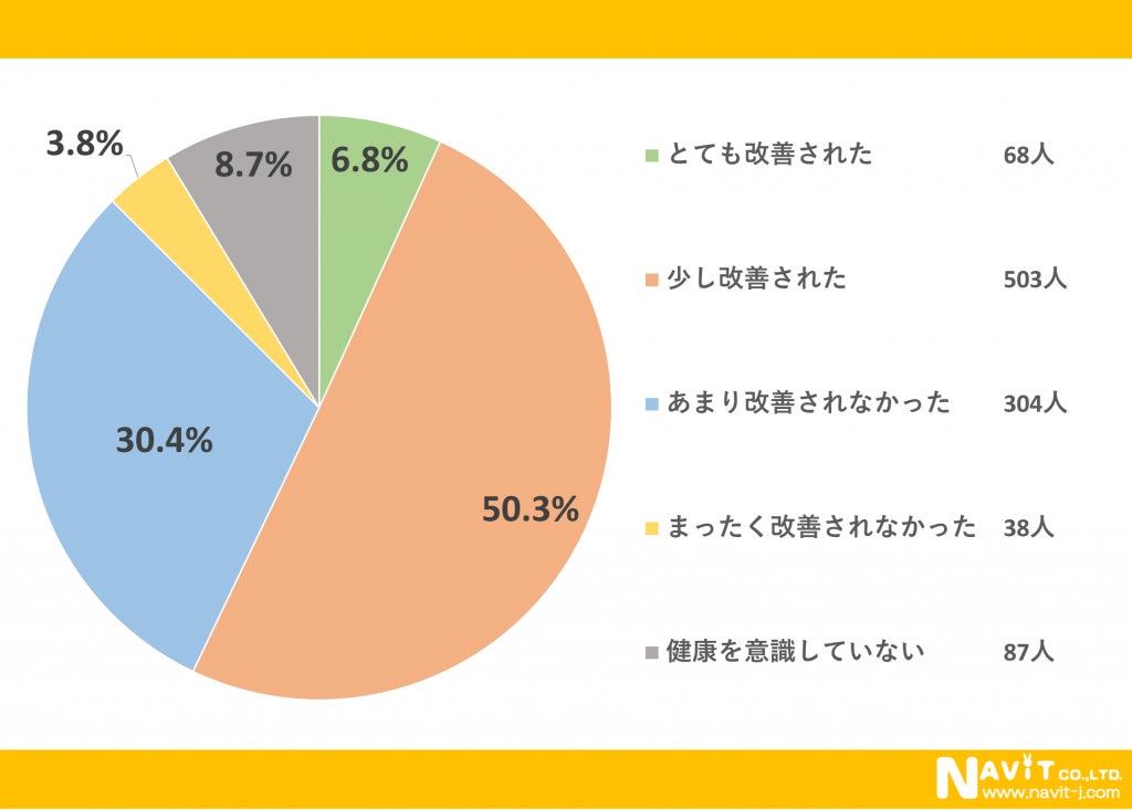 意識で、どこまで健康を改善できるのか。健康を意識して「少し改善された」という方が50.3%です。「あまり改善されなかった」という方も30.5%いらっしゃいますので、健康改善というのは遠い道のりなのでしょうか。