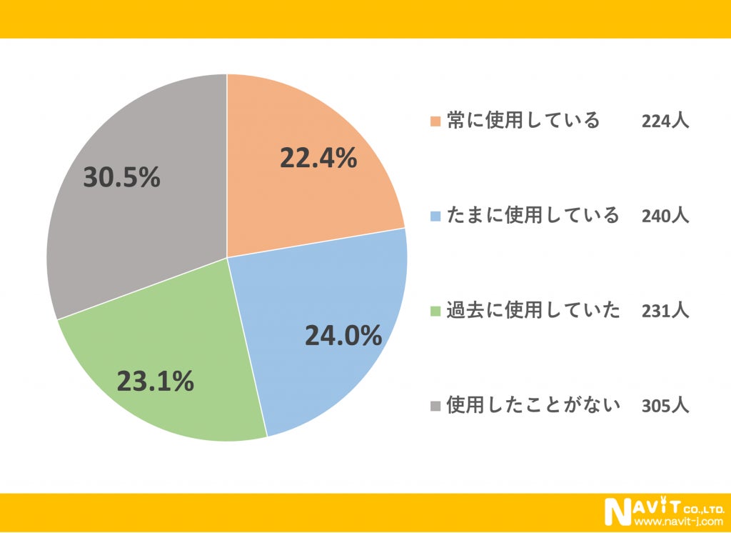 サプリを使用していますか?というアンケートに対して「常に使用している」という方が22.4%となっています。「たまに使用している」という方が24.0%と、約半数の方がサプリを使用しているようです。また「過去に使用していた」という方も23.1%いらっしゃいます。