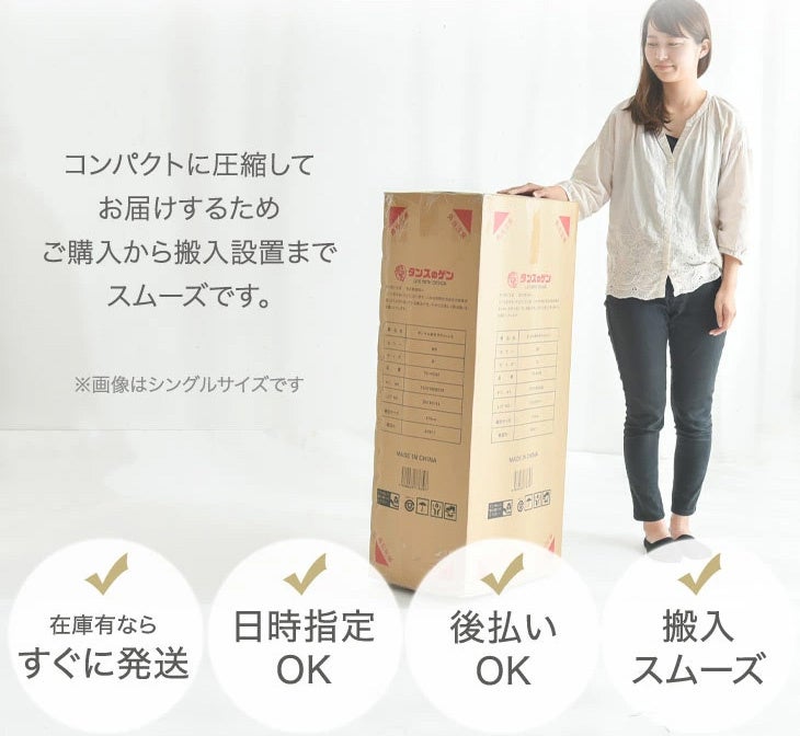 本製品はマットレスが圧縮されたコンパクトな梱包サイズでのお届けとなるため、アパートやマンションでも玄関から設置場所へ搬入がしやすくなっています。また、付属の六角レンチのみで組み立てが可能となっており、ご自身で工具などを準備する必要もございません。このような搬入設置や組み立てにおいても、ヘッドボード付きのベッドとマットレスを揃える場合と比べ簡単に導入することができ、ヘッドボードのある睡眠環境をお手軽に実現可能です。
