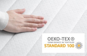 肌が触れる生地には通気性が良くさらりとした触り心地のニット生地を使うことで、ボンネルコイルの通気性の良さもあり、年中快適にお休みいただけます。また、このニット生地は350種以上の有害物質を対象とした世界最高水準の“エコテックス認証”の検査項目をクリアしエコテックス100ラベルを取得しています。