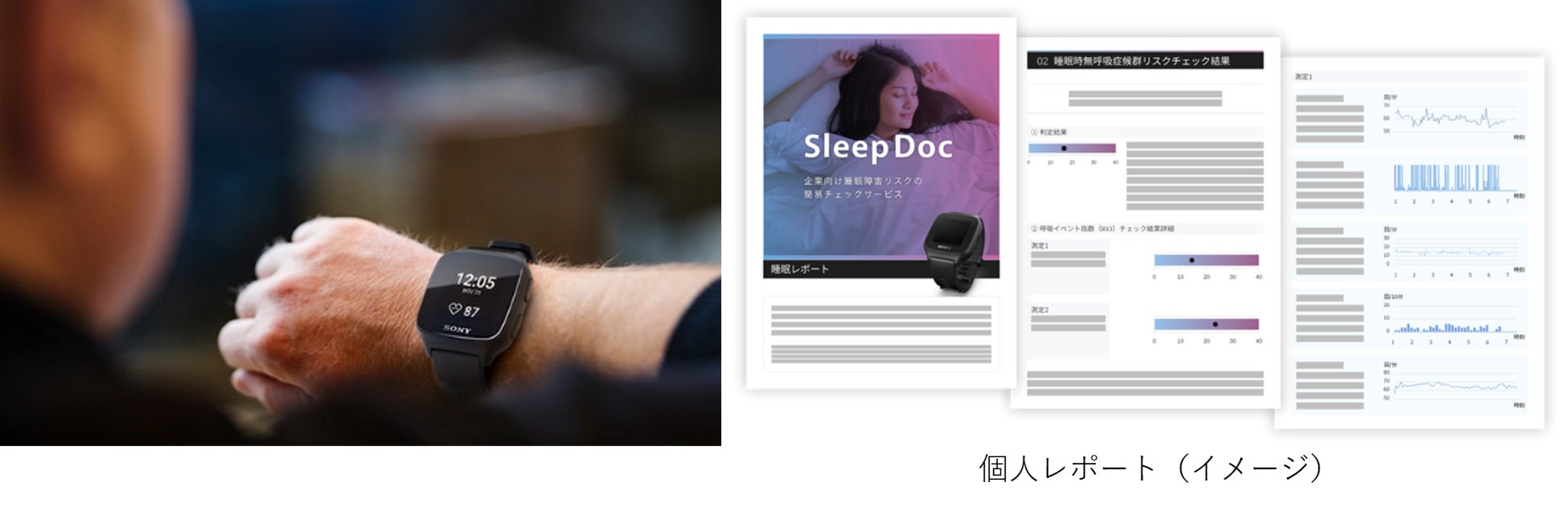 Sleep Docは、スマートウォッチ型のウェアラブルデバイスを睡眠時に装着し、2日間分の睡眠を計測することで、睡眠時無呼吸症候群のリスクをチェックできるサービスです。計測の前に、セルフチェックをすることで、睡眠時無呼吸症候群以外の様々な睡眠障害についても簡易的にリスクチェックを行えます。運輸運送業のドライバーをはじめとした多忙なワーカー、プロ・アマのスポーツ選手等、日々の健康管理とパフォーマンス改善を必要とする方の睡眠課題を可視化します。本サービスでは、睡眠障害リスクチェックに加え睡眠専門医による動画コンテンツの提供や、フォローアップとして看護師による電話相談、信頼のある専門クリニックの紹介も行います。