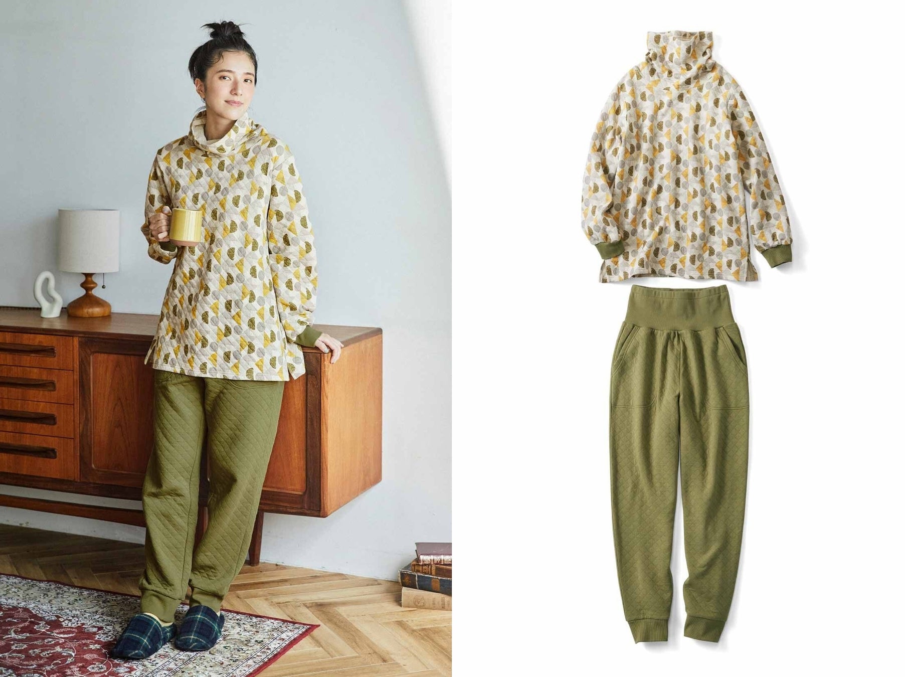 パンツは両サイドに便利なポケット付きで、足首が冷えにくい長め丈。やさしいリブ付きで動きやすいから、自分時間も家事タイムもストレスがありません。トップスは腰まわりまで暖かくカバーするゆったりしたデザインと、ゆほどよく着映える色柄で体形もしっかりカバーしてくれます。