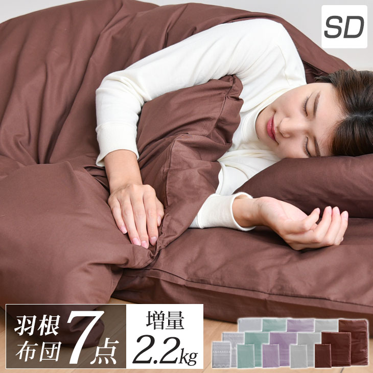 掛布団・敷布団・枕・洗えるカバー3点に収納ケースの8点セットです。掛布団は厳選された『スモールフェーザー(羽根)100%』を約2.2kg使用しており、ふんわりとしたボリュームがあります。